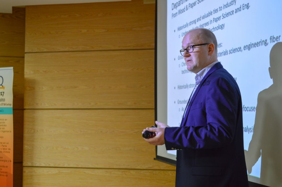 El pasado martes 14 de mayo el Departamento de Ingeniería Química de nuestra Facultad recibió a Marko Hakovirta, Director del Departamento de Biomateriales Forestales de la North Carolina State University, quien además de realizar una exposición a estudiantes y docentes del DIQ, mantuvo reuniones buscando fortalecer colaboraciones entre su departamento y la UdeC.